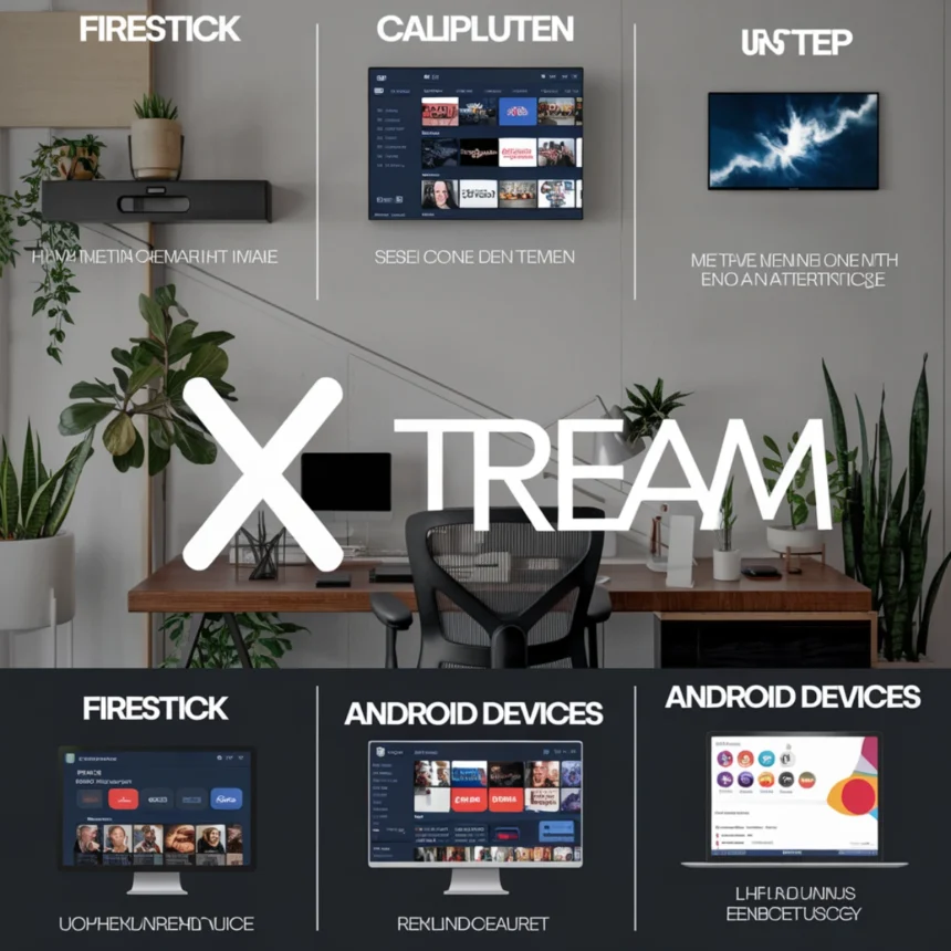 The image showcases a modern workspace with plants and a clean, minimalistic design, featuring a central focus on Xtream IPTV setup for various devices in 2025. The Firestick and Android devices are highlighted, with corresponding setups displayed on a TV screen and computers in the background. The text "FIRESTICK", "ANDROID DEVICES", and "XTREAM" are prominently placed in the foreground, emphasizing the multi-device compatibility for Xtream IPTV. The text also hints at a step-by-step guide for easy installation. Some text on the devices appears as placeholder or gibberish, possibly meant for demonstration purposes ,Complete Xtream IPTV Setup & Download Guide for Firestick and More Devices Quick and Easy Installation in 2025